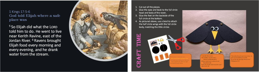 This presentation includes the craft (from Danielles Place) that’s pictured above. After reading the story from the Bible, the kids will have an opportunity to take turns hiding like Elijah and taking that person a snack like the ravens. Of course there’s songs, too. Ravens are the spotlight on nature, of course. These are intelligent birds!