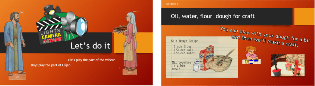 After hearing the story, the kids get to act out the story of Elijah coming to the widow of Zarepheth found in 1 Kings 17:7-24. They can make some dough also and then use it to make a recipe card holder. Materials include flour, salt, water, dixie cup, popsicle stick, and a clothespin. The presentation includes songs and videos of meerkats caring for eachother. God cares for us and wants us to care for others.