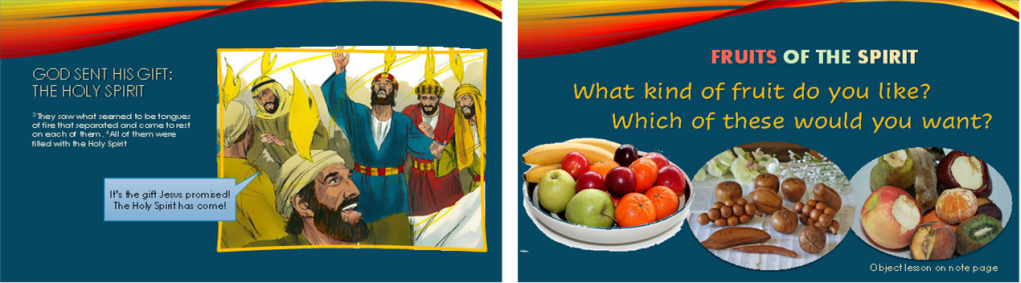 50 days after Israel was set free from Egypt, God met them at Mt. Sinai. He reminded them how He had cared for them and told them that He had chosen them to be a kingdom of priests. They were to tell others about God. God made a covenant with them and gave them the 10 Commandments. After Jesus died and rose again, He appeared to the disciples over 40 days, then He ascended to heaven. 50 days after He rose again, it was Pentecost. God sent the Holy Spirit on that very day. The Holy Spirit guides us, teaches us the truth, and empowers us to tell others about God. The fruit of the Spirit is love, joy, peace patience, faithfulness, gentleness, and self-control. The presentation includes an object lesson about the Fruit of the Spirit and a craft.