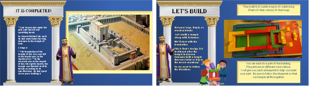 God chose Solomon to build a temple for His Great Name. Get out the Duplos and build along with Solomon! Note the resources below. What a beautiful testimony to God’s greatness, goodness, and love!