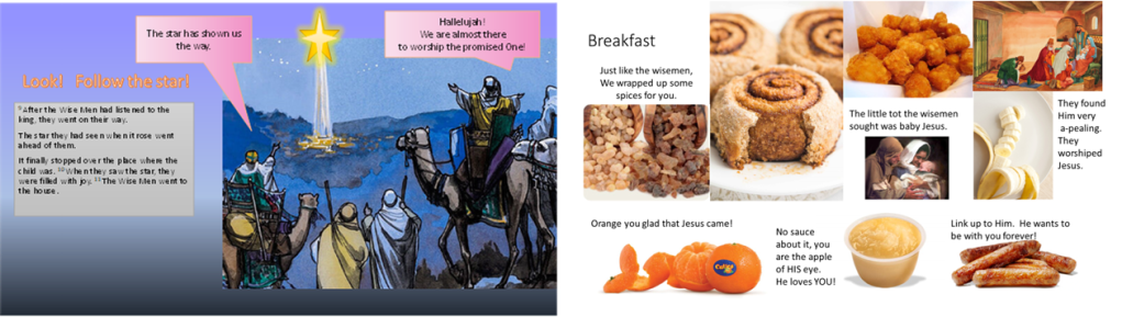 This presentation starts with a yummy breakfast celebrating Jesus’ birth. While kids are finishing eating, they have an opportunity to search for particular items having to do with the story. I hid pictures of the items around the room, under the tables, behind the chairs etc. They had fun searching for things like the Wisemen searched for Jesus. Afterwards we acted out the story. We had costumes for the 3 Wisemen, Mary, Joseph, King Herod, and a large star on a stick for one of the kids to hold and guide the Wise men (like follow the leader). The kids really had fun!