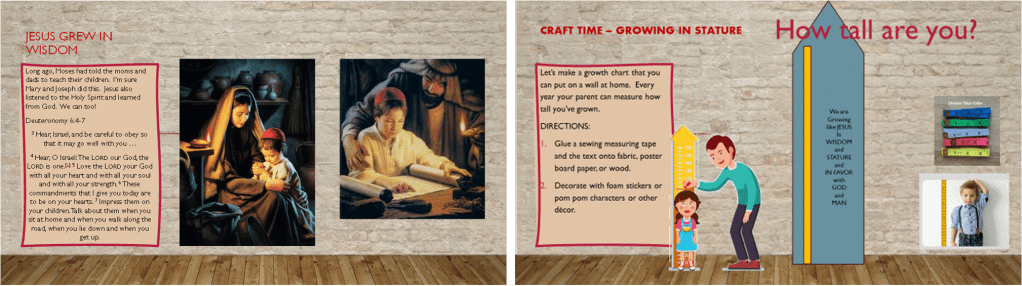 In this presentation we explore what it means to grow in wisdom by reading the scriptures and playing a game. The craft shown above helps us learn what it means to grow in stature. Attach a measuring tape to a colorable set of pages. We also talk about growing in favor with God and man. We practice helping ‘mommy Mary’ cook by making biscuits for snack and helping ‘dad Joseph’ build a box with popsicle sticks. There are a lot of fun activities in this one.
