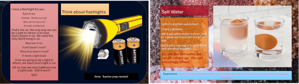 This presentation starts with Jesus calling Matthew to be one of his disciples. Later at a dinner at Matthew’s house, the Pharisees ask why Jesus eats with tax collectors and sinners. Jesus replies that He has come to call sinners. On the Sermon on the Mount, Jesus tells us that we are the salt and light of the world. This presentation continues by exploring how we are like salt and light to the world. It includes experiments, snacks, songs, and crafts. We are to share the light of God’s truth and His love to all around us. Our good deeds glorify God and help others.