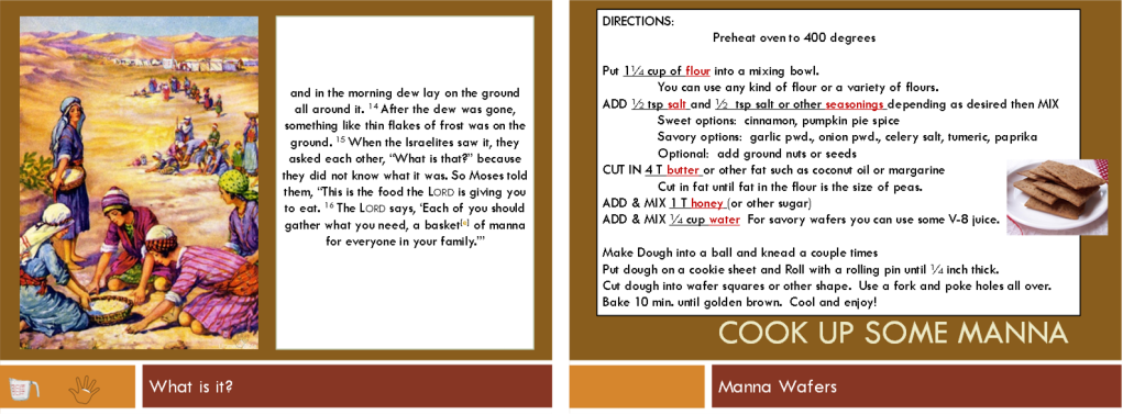 Let’s learn about a special day, the Sabbath, that God gives us to worship him. It’s the first holiday! I like to spread out a clean sheet and cover it with something like sweet cornflakes or rice-crispies. Then I give each child a quart jar so that they can gather ‘manna’ cereal while we review the story and talk about our wonderful God. This Sabbath activity teller gives kids and families great ideas to do on Sabbath. Print the pages back to back.