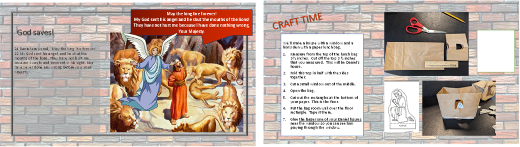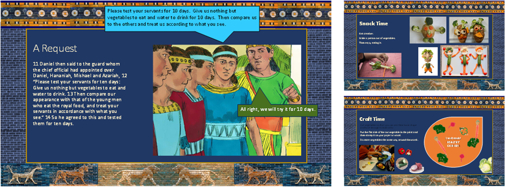 In this lesson the kids can participate by reading what the conversation bubbles. The craft is to stamp with vegetables and the snack is to make a vegetable person. Daniel and his three friends chose to eat only vegetables rather than eat at the unclean and unhealthy food at the king’s table. We too can make healthy choices.