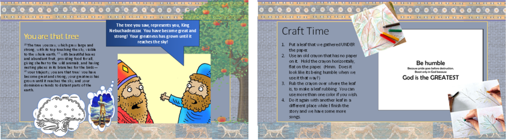We’ll start outside laying down on a blanket, looking up at a big tree, like that one in Nebuchadnezzar’s dream, and talk about that dream. We’ll look and listen for birds and animals, ‘pick’ some fruit hung on the tree, collect leaves for the craft, and pretend to be animals in a game of charades. Inside, we’ll continue the story, color a picture, look up some Bible texts, sing, and do the craft. Along the way, we’ll learn that pride goes before a fall and that God is the Greatest of all!
