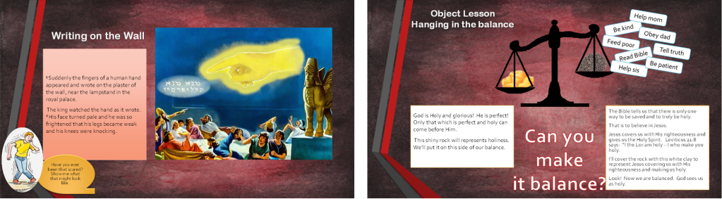 After King Nebuchadnezzar died several weaker kings ruled Babylon. Belshazzar did not honor God. At a banquet, he even used God’s holy temple’s goblets. We’ll talk about how we treat extraordinary things, especially holy things, with respect and honor. God wrote a message on the wall. Number, number, weight, division. We’ll talk about what it means to weigh things in a balance and use this illustration to show that the only way we can be righteous or holy is through our belief and faith in Jesus.