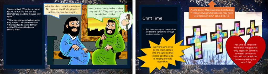 Nicodemus wanted to know God’s plan. He went to talk with Jesus at night. Jesus told him God’s plan, but Nicodemus had a hard time understanding. Jesus gave illustrations that tell us that the only way we can really know God’s plan is to experience it. Jesus came as part of God’s plan to save all who will turn to Him. He said, “I, if I be lifted up, will draw all people to myself.” John 12:32. Remember John 3:16-17. The kids will have an opportunity to retell the story of salvation through the Savior Souvenirs.