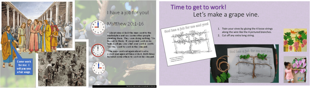 Will there be a reward for those who work for the Lord? Yes. But don’t be surprised if those who work less or join the work force later get the same reward. What does it mean to work for the Lord or work in his vineyard? God is interested in each of us producing much fruit. When we care for others and share God’s love, we are producing good fruit in us and others. In our craft we learn how to train grape vines. In the presentation we also talk about the importance of doing a good job at your work.