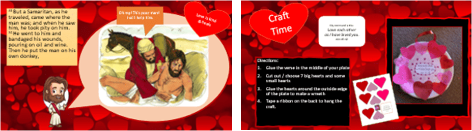 What are the two greatest commandments? Love God and Love your neighbor as yourself. Who is your neighbor? Jesus responded with the story of the Good Samaritan. In this presentation, we read the account from the book of Luke. We reenact the story and learn some basics of first aid. The craft reminds us to love one another.