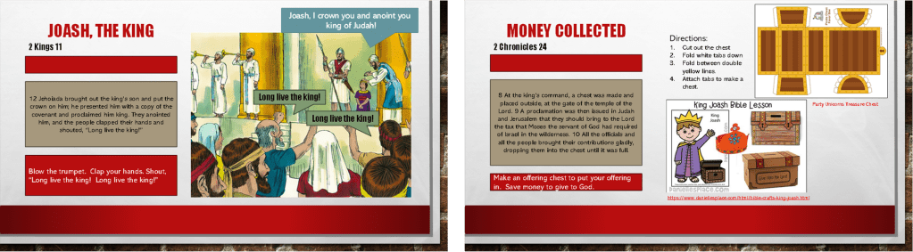 As a baby, Joash was rescued. He learned to love the Lord. He really wanted the temple of the Lord to look beautiful again. He collected money and made sure that repairs were made. We too can bring our offerings to church so that it looks great and others can get to know God, too.